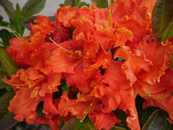 Саженцы Азалии гибридной Спениш Денсер (Azalea Knap Hill spenish-denser) — один из наиболее ярких и эффектных сортов. Его цветы однотонные, насыщенного оранжевого оттенка. На краях лепестков присутствует легкая бахрома, что делает их особенно объемными. Цветение длится с мая по июнь и начинается еще до распускания листьев. Азалия Спениш Денсер — это не слишком высокий (до 130 см), но очень широкий (до 150 см) кустарник. В саду он предпочитает открытые или немного затененные участки, при этом листья и цветы будут одинаково насыщенными. Особого ухода сорт не требует: достаточно регулярно поливать растение, а при резких заморозках (при температуре ниже -25 градусов) сделать укрытие.