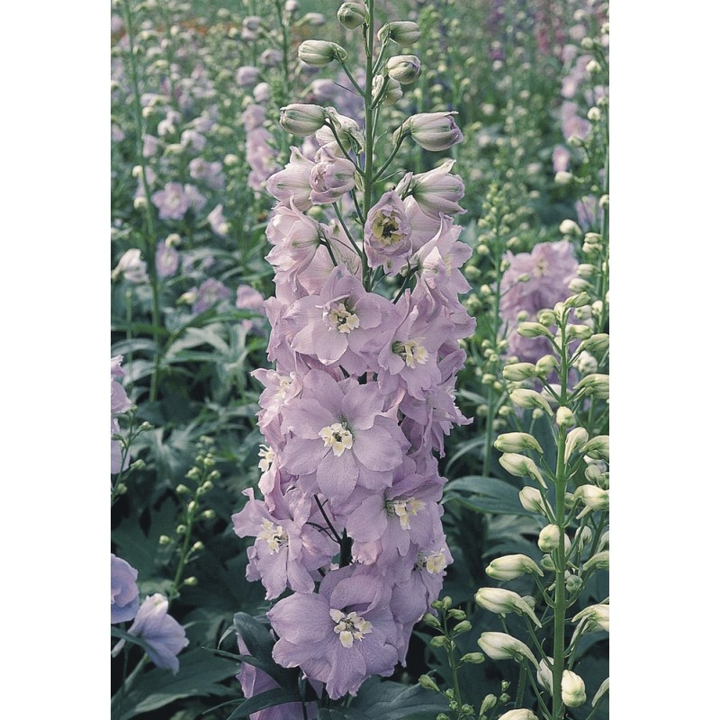Рассада дельфиниума Камеллиард (Pacific Giant Camelliard) имеет темно-зеленую листву и вырастает в высоту до 150 см. Период цветение попадает на июнь-июль. Соцветие высокое, плотно укрытое крупными цветами светло-сиреневого цвета. Удачно смотрится на любом садовом участке. Достоинства Камеллиард: