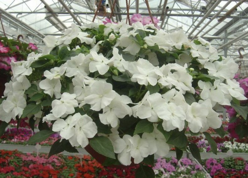 Семена бальзамина ампельного «Акробат Вайт F1» (Impatiens) высевают на рассаду в середине марта. Через 100 дней сеянцы можно будет либо высадить в грунт, либо посадить в горшки для дальнейшего выращивания. Идеальный грунт для культуры — это смесь торфа, песка, вермикулита и компоста. Место для выращивания должно быть хорошо освещенное. Бальзамин ампельный «Акробат Вайт F1» — это красивый куст диаметром 50-60 см и высотой около 40-50 см. Сильно ветвящиеся побеги растения густо покрыты небольшими темно-зелеными листиками. Многочисленные белоснежные цветы появляются в июне. Цветение продолжительное.