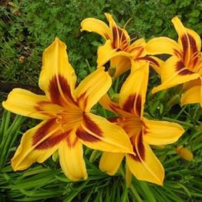 Лилейник гибридный "Джери Скаут" - это великолепное растение с яркими желтыми цветками, украшенными коричневато-красными мазками в центре. Этот сорт лилейника, созданный оригинатором Парри в 1968 году, порадует вас своими крупными цветками диаметром до 15 см. Высота растения достигает 40 см, что делает его идеальным для групповых посадок в солнечных местах.