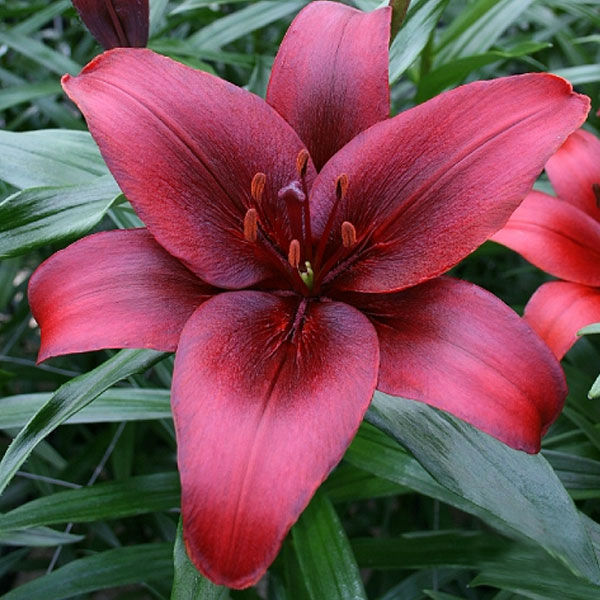Саженцы и рассада декоративной Лилии азиатской Блэк Джэк (Lilium asiatic Black Jack) вырастают до 70 см в высоту. Цветок очень редкой окраски — темно-красный ровный цвет без переходов к основаниям лепестков, без крапа, с точным повторением цвета в тычинках. Лепестки глянцевые, по 6 в каждом цветке, две трехлепестковые чашечки. Начинает цвести в конце июня. Сорт отличается морозостойкостью, не требует укрытия на зиму, но почву стоит мульчировать торфом или сухими листьями. На одном месте живет 3-4 года. Идеален для букетов в качестве основного элемента, в миксбордерах и групповых посадках.