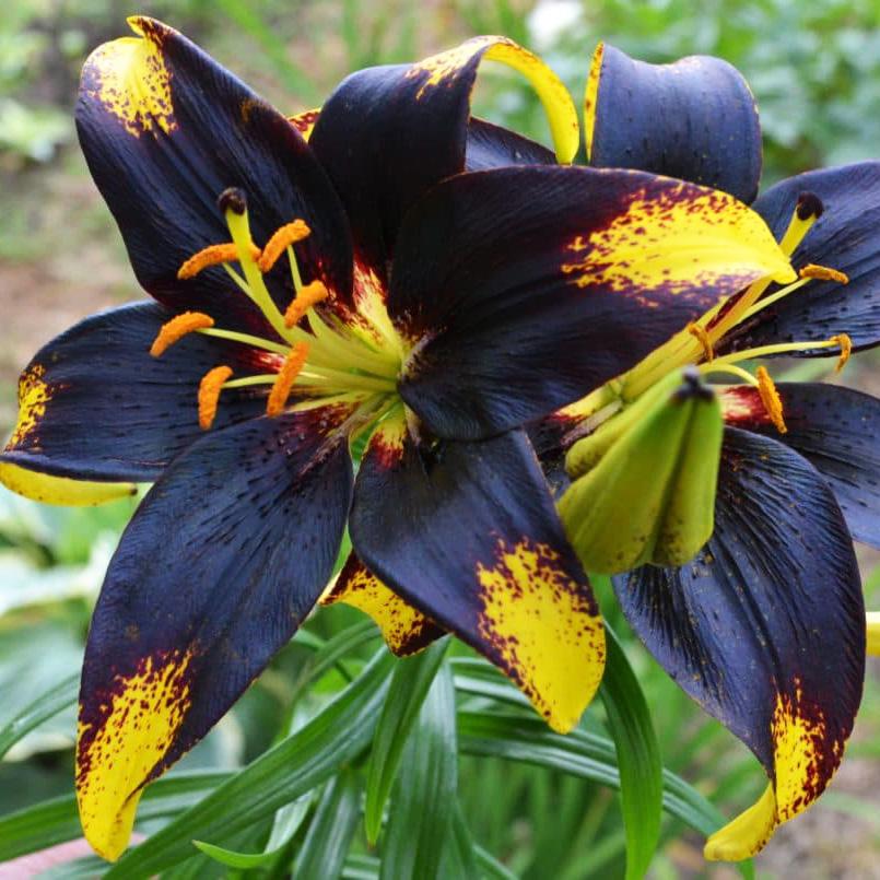 • Окраска цветка : цветы золотисто-желтые, с многочисленными темными крапинками, сливающимися в широкую темно-лиловую сердцевину, классической звездчатой формы, широко-раскрытые, направлены вверх и в стороны