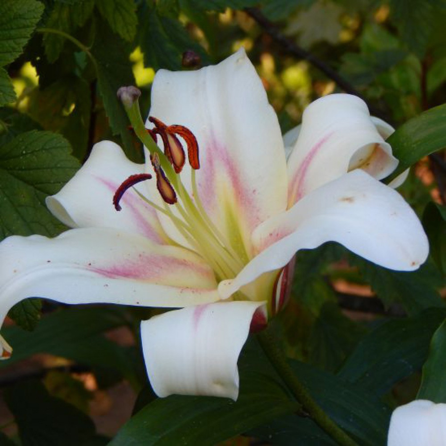 Лилия от-гибрид бонбини - это великолепное растение, которое поразит вас своей красотой и изысканностью. Ее стебель достигает высоты до 90-100 см, а цветки имеют размер впечатляющих 25 см. Лепестки белого цвета с бордовым оттенком создают неповторимый вид, а желто-зеленое горлышко придает цветку особую изюминку.