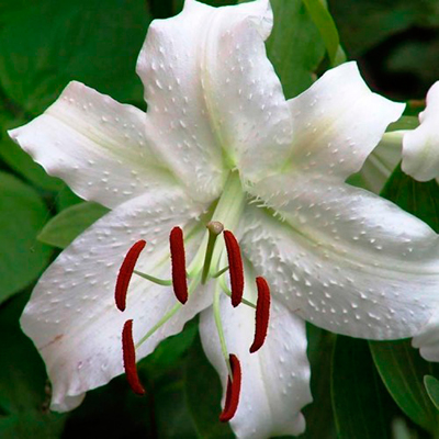Саженцы и рассада Лилии восточная Касабланка (Lilium Oriental Hybrid Casa Blanca) – это классический пример королевских лилий. Высота стебля до 120 см, стебли прочные, листья темно-зеленые удлиненные. Цветки крупные, до 25 см в диаметре, с волнистыми широкими лепестками загибающимися от центра цветка. Белоснежные классической формы лилии с легкой зеленью у основания лепестка, без крапа, шелковистой фактуры. Очень эффектно выглядят в срезке (в букетах, украшениях помещений, по одному в вазонах), групповых посадках, миксбордерах. Цветут в августе распространяя нежный пряный аромат.