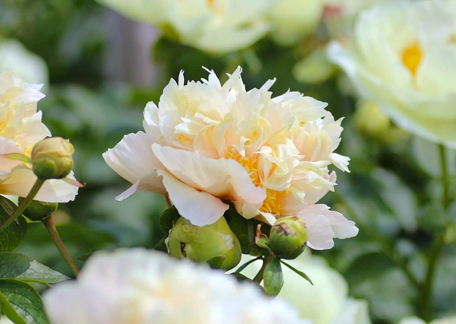 Саженцы пиона ИТО Quitzin (Квитцин) Это эксклюзивный, уникальный сорт с огромными полностью махровыми цветами, десятки тысяч лепестков заполняют цветок: в результате получается эффектная, нежный шар. Распускается громадным жёлто-зеленоватым облаком, в процессе раскрытия зеленый цвет бледнеет, становится светлее. Внешние лепестки желтовато-кремовые, внутренние перемешаны с желтыми тычинками с оттенком персикового цвета у основания. Отличные крепкие стебли, обильно цветущий, мягкий, сладкий аромат. Неудивительно, что этот цветок - один из наших самых любимых пионов среди коллекционеров. Бутоны распускаются постепенно: сначала верхушечные, а затем боковые. Благодаря этому взрослые кусты отличаются продолжительным цветением. Саженцы пиона ИТО образуют привлекательные плотные, аккуратные округлые кусты с крепкими стеблями и узкими, темно-зелёной листвой, которая остается зеленой до осени. ИТО-пионы - это уникальные сорта, полученные путем скрещивания травянистых и древовидных пионов. Им присущи лучшие качества обеих групп: многолетники выносливы и устойчивы к жаре и влажности. Характерные особенности растения: