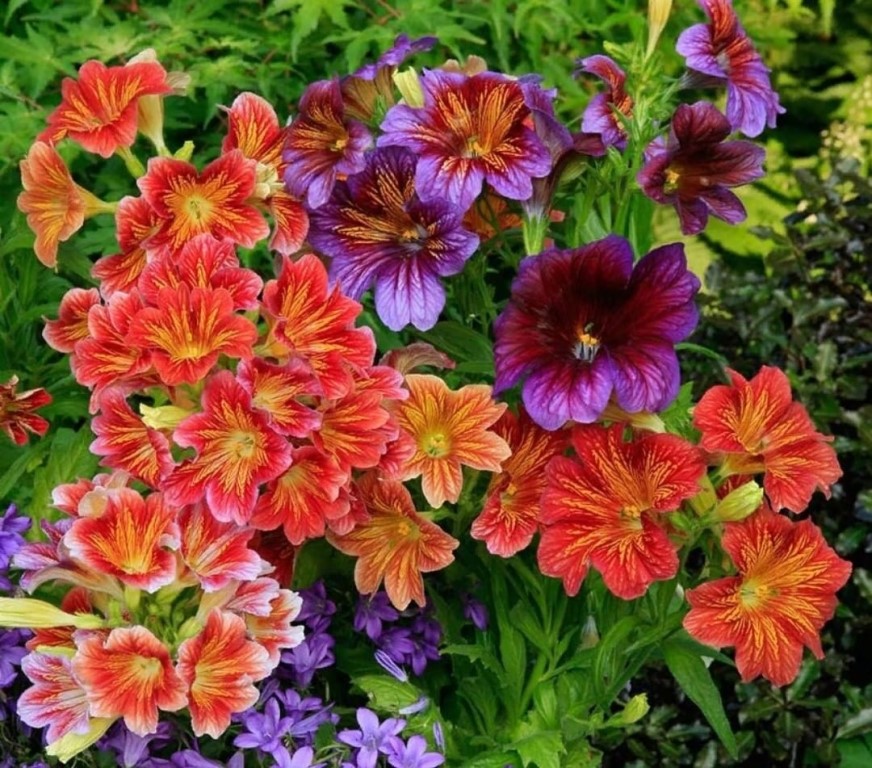 - красные. Семена сальпиглоссиса подходят для украшения садовых посадок, а также могут использоваться составителями букетов для получения экзотических экземпляров. Рассада сальпиглоссиса требует тщательного ухода: растение не переносит переувлажнения, боится холода и засухи, зато радует длительным цветением.