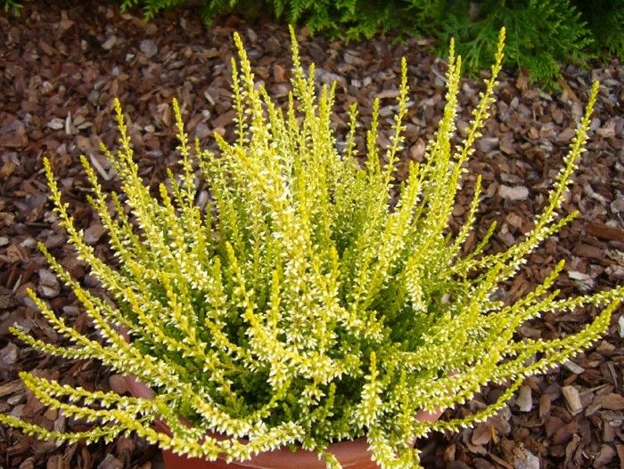 Саженцы вереска обыкновенного Сэнди (Sandy) образуют яркий привлекательный кустарник высотой 30 сантиметров. Крона шарообразная, густая. Побеги растут радиально – вверх и в стороны. Они покрыты зеленовато-желтыми шиловидными листиками. В августе на ветвях распускаются многочисленные ароматные белые цветки – колокольчики. Бутоны не погибают при небольших заморозках, украшая куст до ноября.